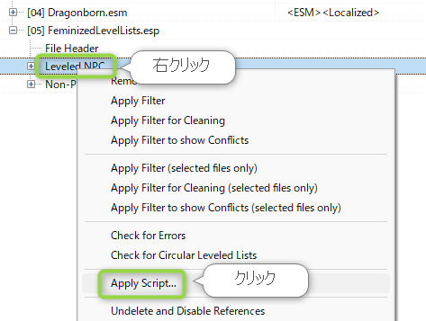 読み込んだespファイルのツリーを展開し、「Leveled NPC」を右クリック、その後、「Apply Script」を選択します。