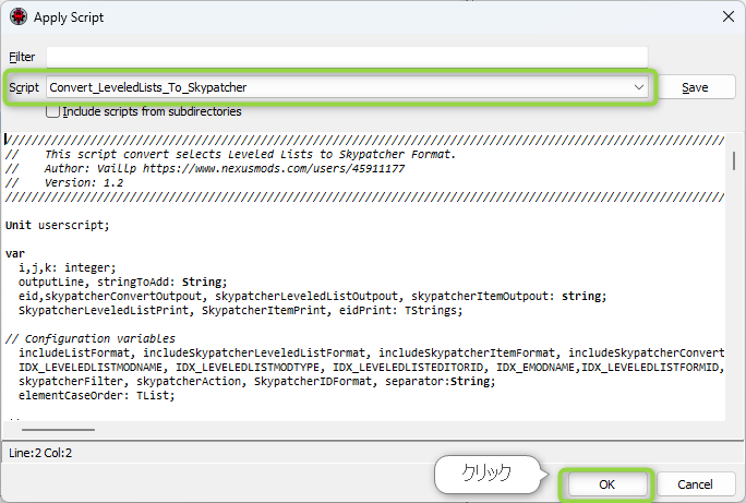 Scriptのプルダウンから「Convert_LeveledList_To_Skypatcher」を選択し、OKをクリックします。