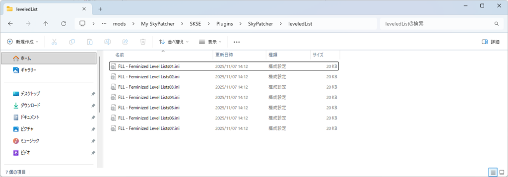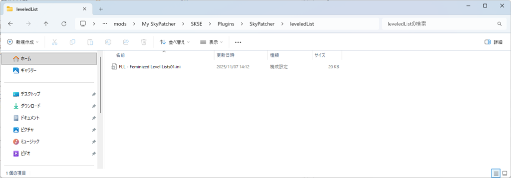 ファイルは、「SKSE\Plugins\SkyPatcher\leveledList」に置きます。
