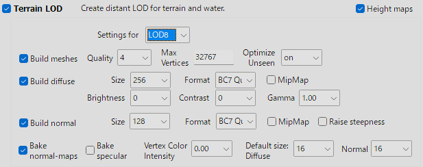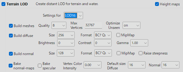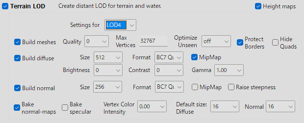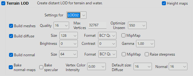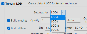 私は Flat World Map Framework (FWMF) を使っているので、LOD32は単なる遠景としてLOD16のさらに半分の品質で作成しています。