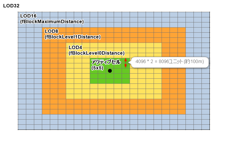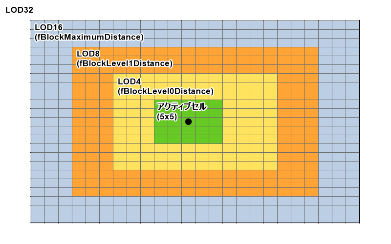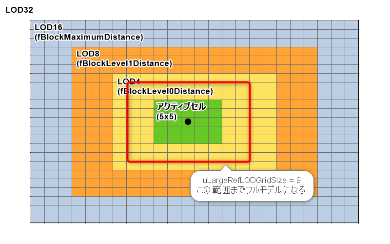 アクティブセルはLODではなくフルモデルが描画される領域です。これはプレイヤーの周囲5×5セル固定です。