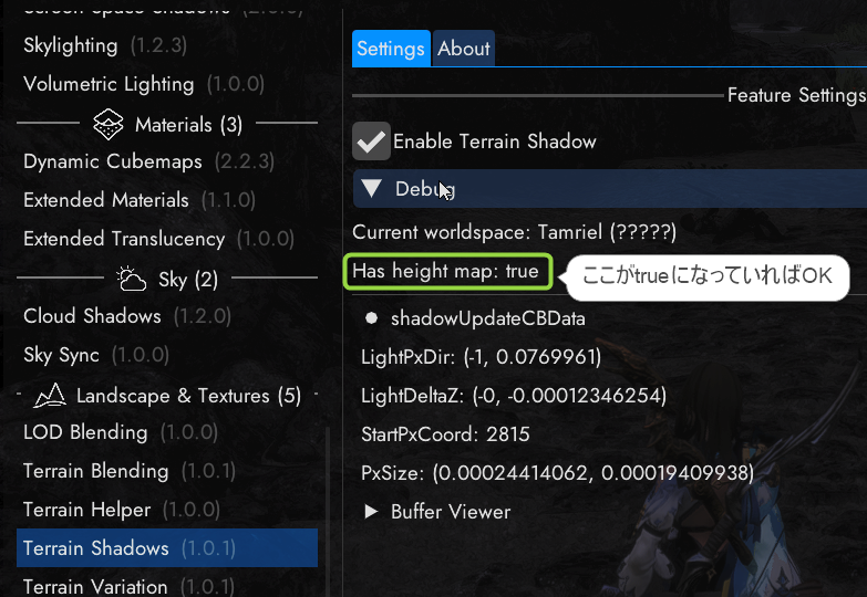 Height mapを作っている場合は、Terrain Shadowsの「Debug」→「Has height map」から確認できます。