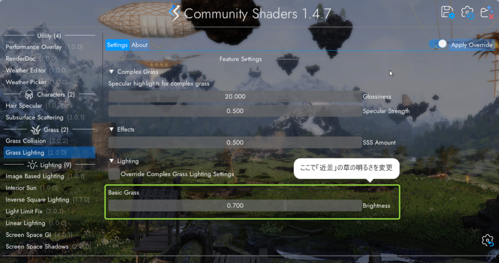 Community Shaders の場合、「Grass Lighting」で調整できます。