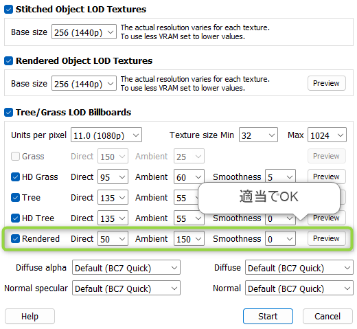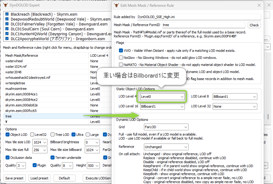 マシンスペックに不安があるなら、Highプリセットを選んだ後にここだけLODモデル(Billboard1)に変更しても良いと思います。