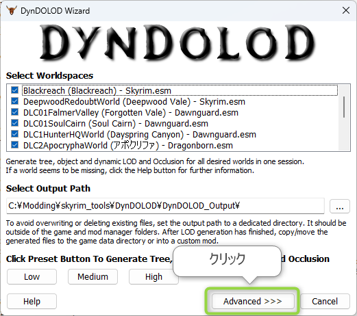 LODモデルの作成が完了したら、いよいよ最終工程であるDynDOLODの実行に移ります。