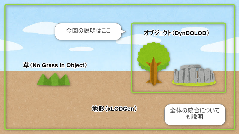 遠景は大きく地形、草、木や建物オブジェクトの3種類に分かれます。