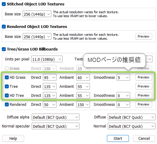 こちらは「Sacred Garden – A Grass Overhaul」の推奨値です。