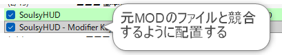 この中の「SoulsyHUD.dll」「SoulsyHUD.pdb」をオリジナルのファイルに上書きコピーしてしてインストール完了です。